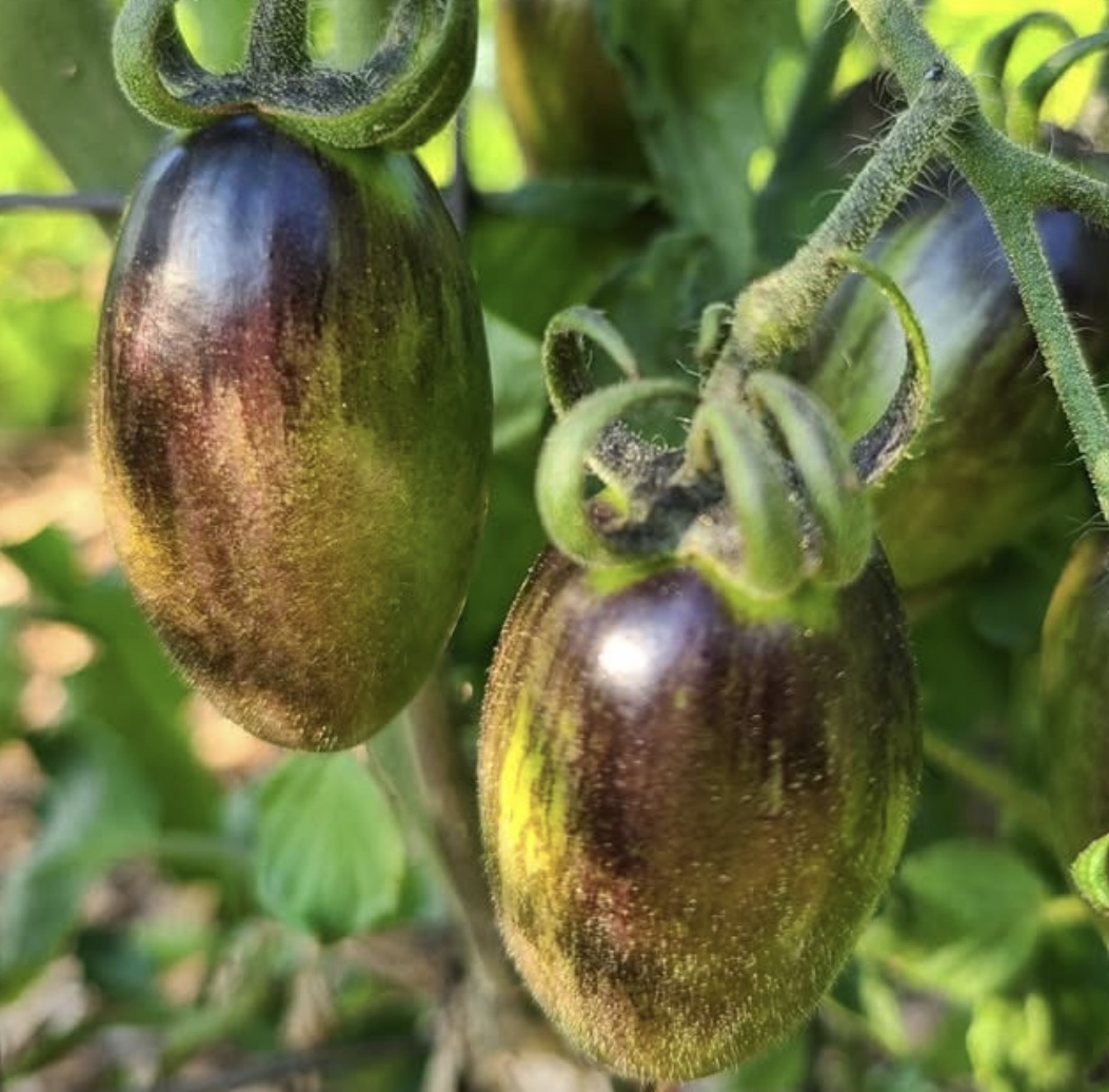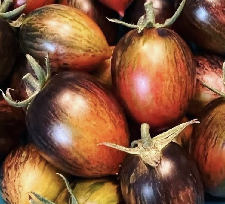 Brad’s Atomic Grape is one of the most amazing looking tomato varieties that you’ll ever see! Don’t let the wispy growth habit fool you, in the right conditions this is a highly productive variety. The fruit are split resistant, bullet-shaped, and brilliant colored with streaks of green, yellow, orange, red, and indigo! When fully ripe Brad’s Atomic Grape Tomato is well balanced, semi-sweet, and will undoubtably be one of the prettiest things in your garden.