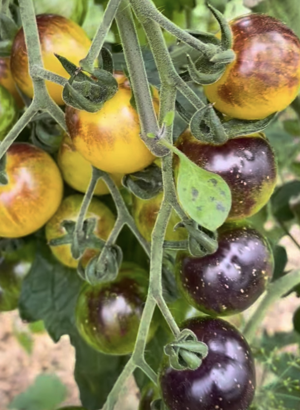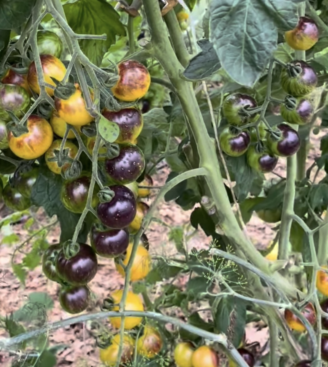 Cosmic Purple Rain is an exciting newer variety! Sprawling plants produce insane amounts of medium-sized, crack-resistant, cherry tomatoes that are golden with a ton of indigo coloration. These are tasty and nutritious, loaded with anthocyanin, which is the same naturally occurring antioxidant that is found in blueberries. Cosmic Purple Rain is a rare tomato variety but will quickly become one of your favorites!